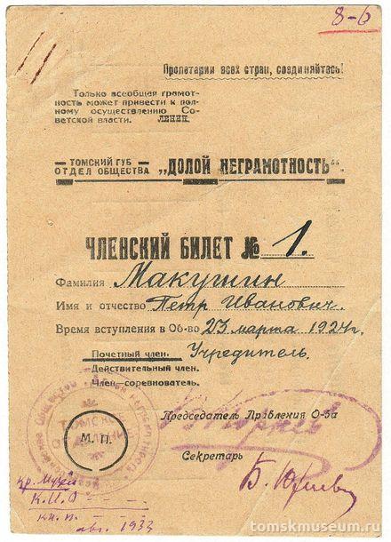 Членский билет № 1 П.И. Макушина, учредителя Томского губернского отдела общества «Долой неграмотность».