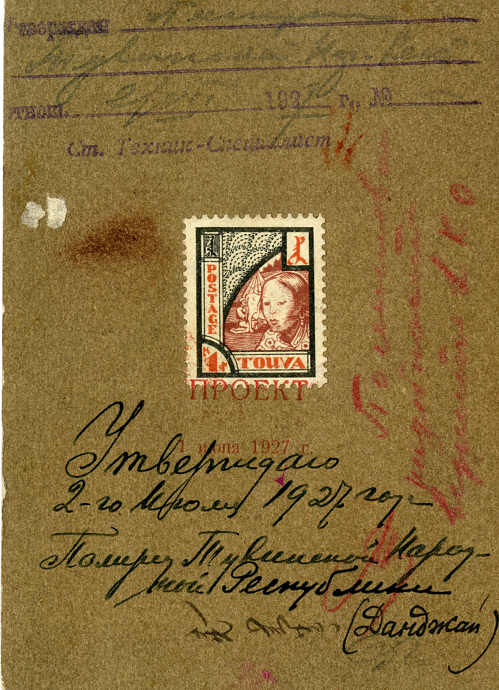В фондах Гознака сохранились все 14 проектов марок третьего выпуска, наклеенные на паспарту и утвержденные полпредом ТНР в СССР Оюном Танчаем (Данджаем) в июле 1927 года.