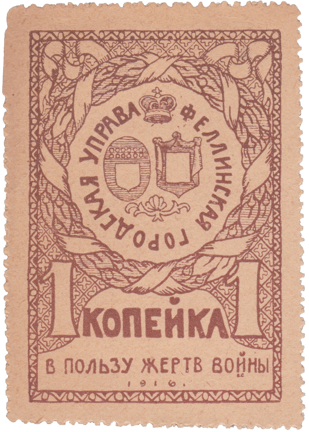 Феллинская городская управа. Феллинская Уездная Комиссия по оказанию помощи семьям призванных на войну. Зубцы. Коричневая.
