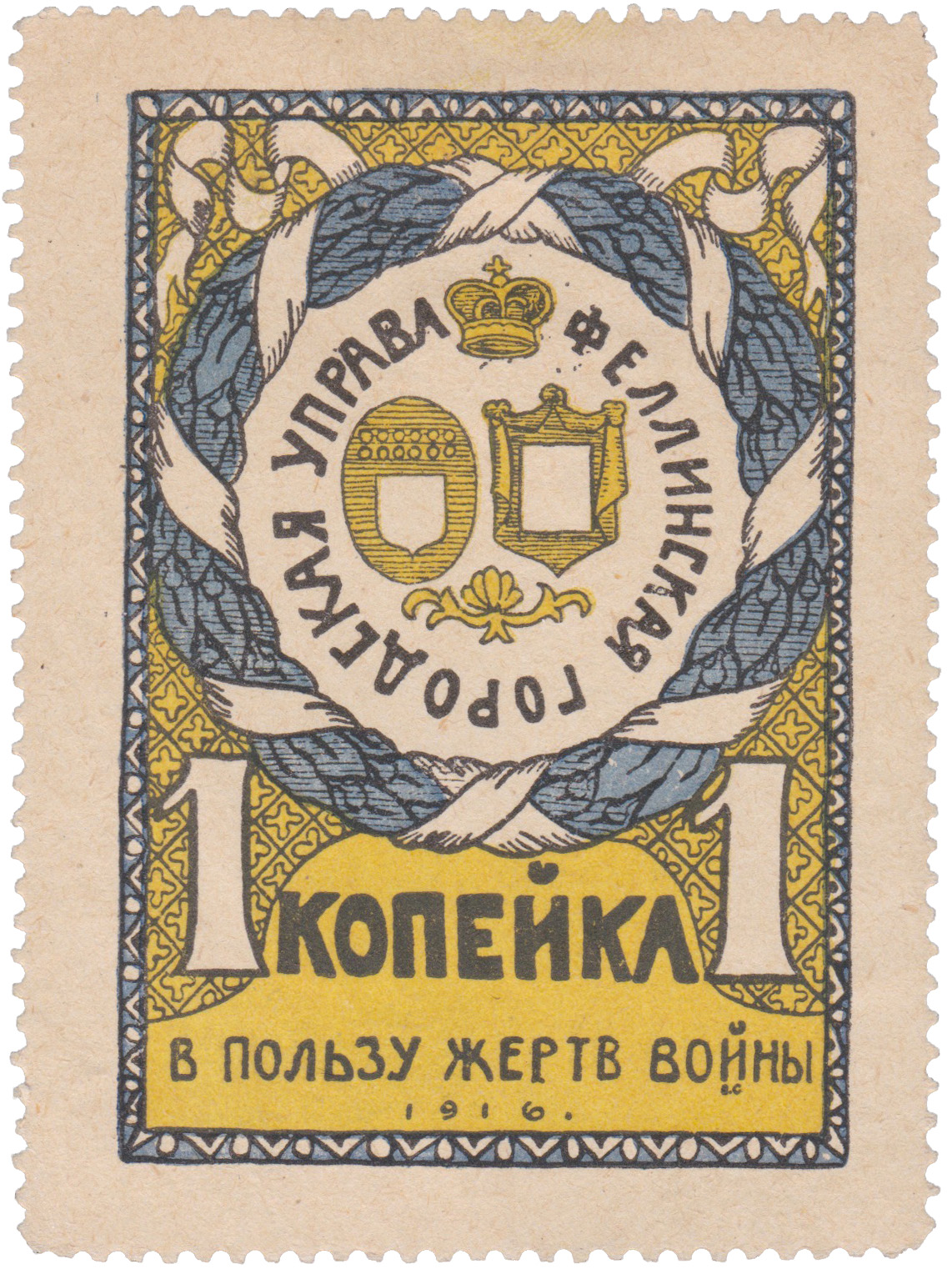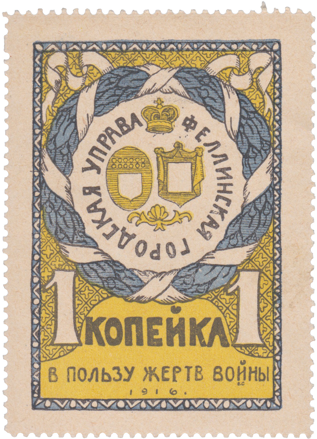 Феллинская городская управа. Феллинская Уездная Комиссия по оказанию помощи семьям призванных на войну. Зубцы. Синяя-желтая.